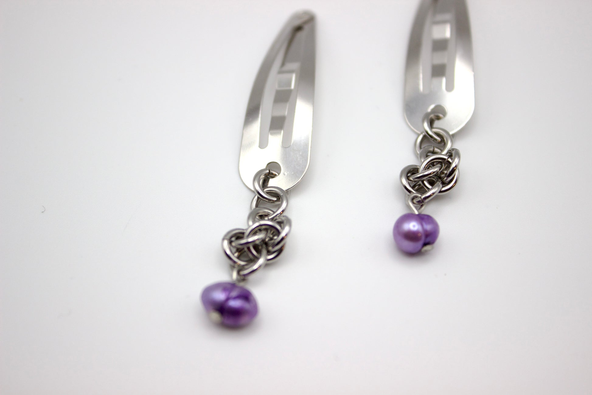 Materials: stainless steel jump rings, nickel plated steel hair clip, freshwater pearls