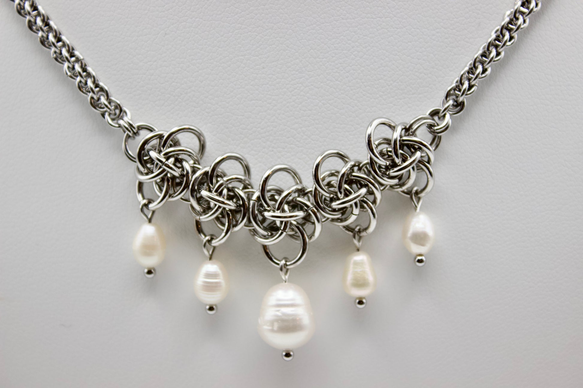 Materials: stainless steel jump rings and findings, freshwater pearls